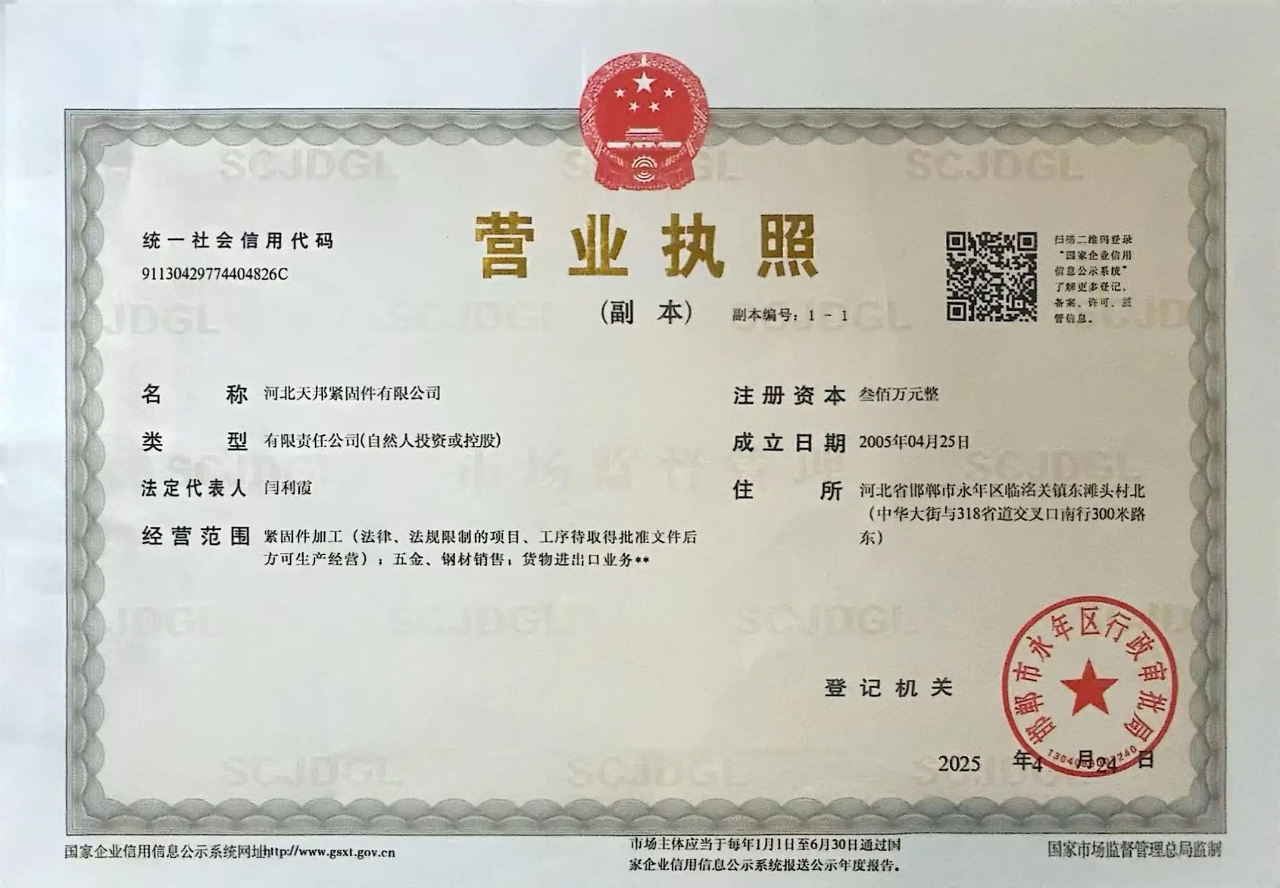 Registered address : North Of Dongtantou Village, Linmingguan Town (300 Meters South Of The Intersection Of Zhonghua Street And Provincial Highway 318) Handan Hebei China